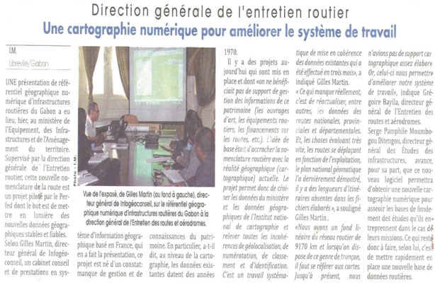 En 2012 avec le bureau PMC, nous avons participé à l'élaboration des Plans de travail ministériel du gouvernement gabonais. Il s'agissait en particulier pour ce qui nous conserne d'identifier l'ensemble des projets susceptibles de faire appel à la connaissance géographique, une des priorités ayant été donnée à la mise en place d'un Plan intégré de la connaissance du patrimoine.